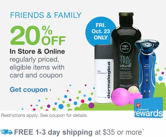 Friends and Family Sale at Walgreens - 20% Off Coupon ... Friends and Family Sale at Walgreens - 20% Off Coupon On October 28 only, you can get 20% off regularly priced eligible merchandise at Walgreens when you use the printable coupon. These coupons include most regularly priced items in the store with some exclusion like gift cards, stamps, alcohol, etc.